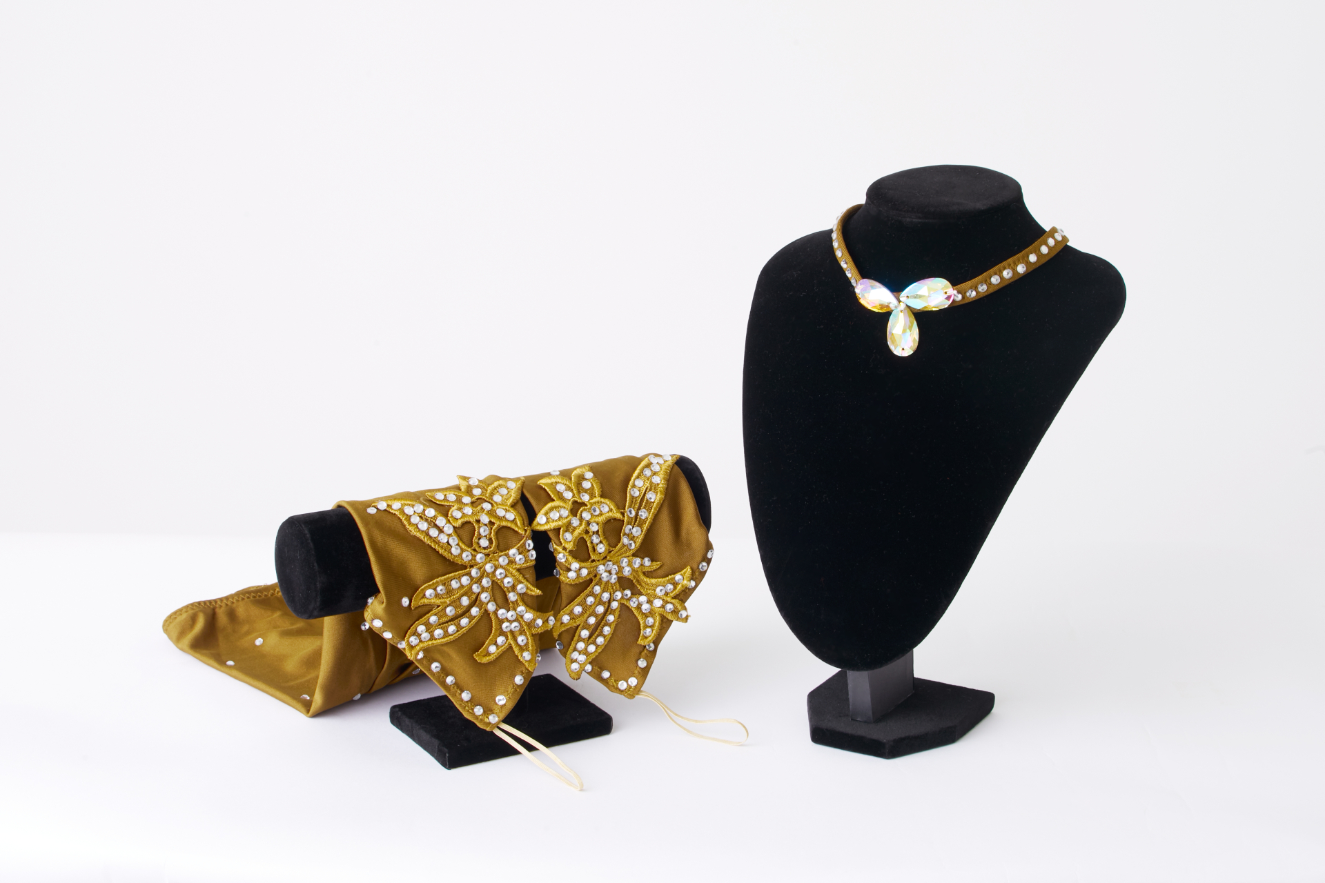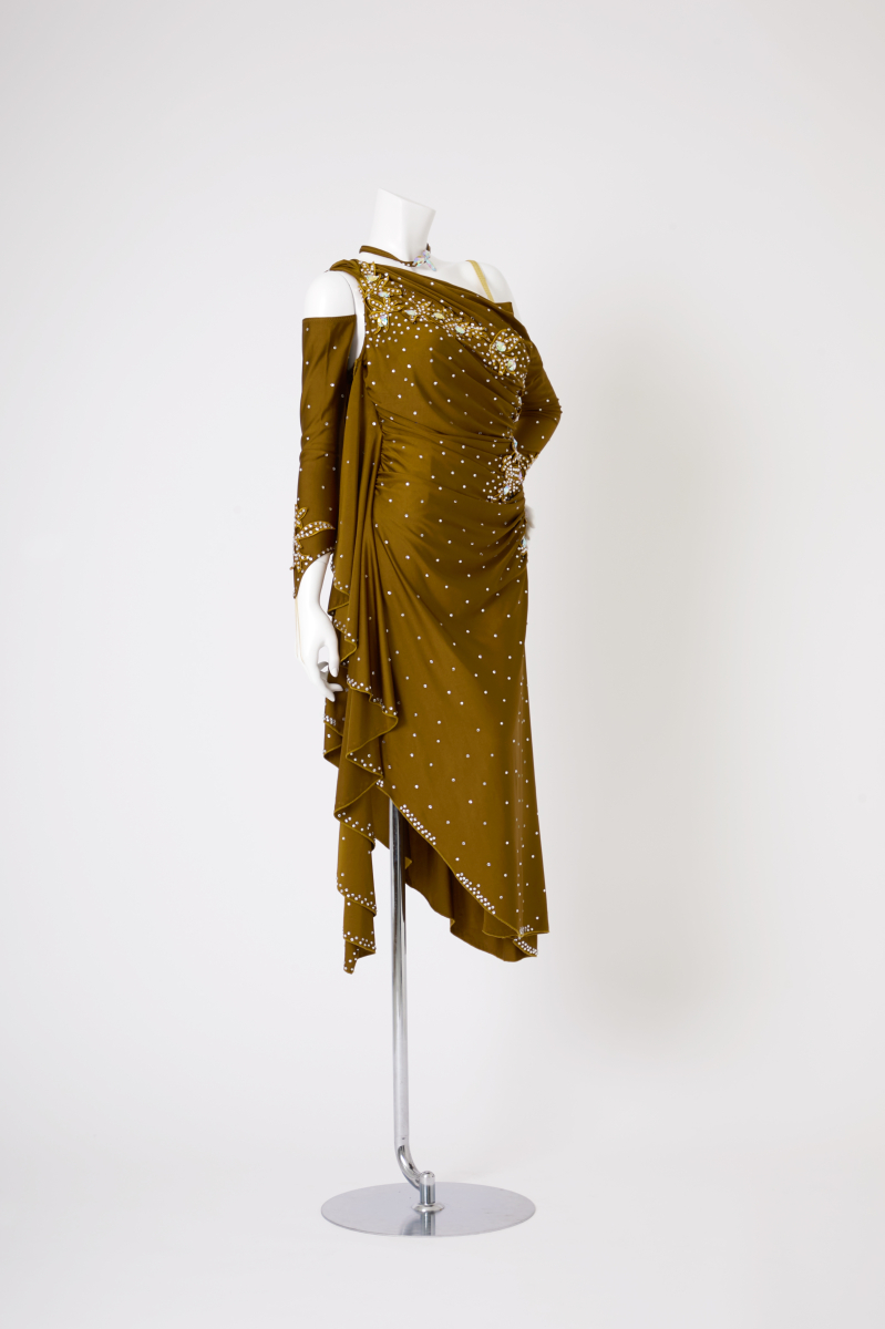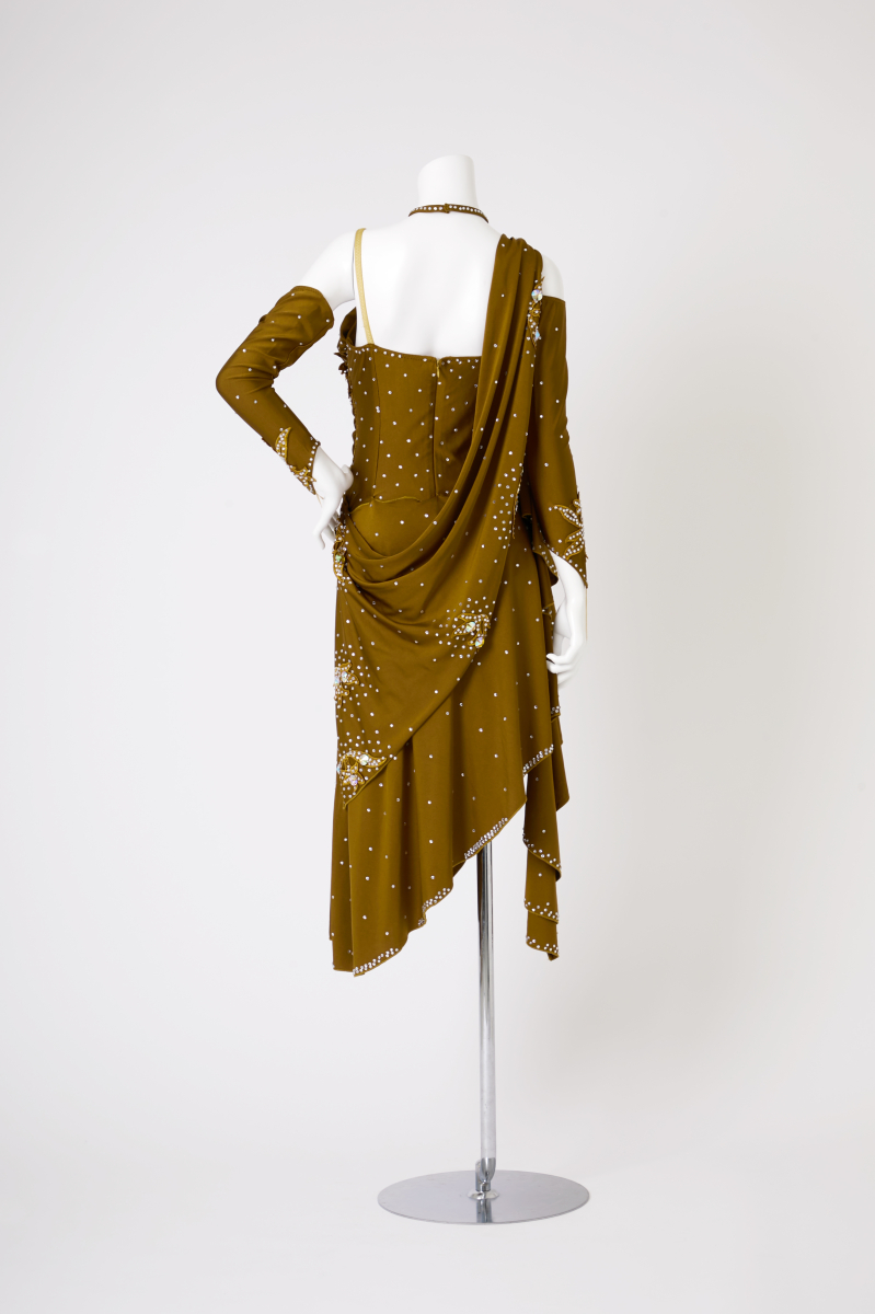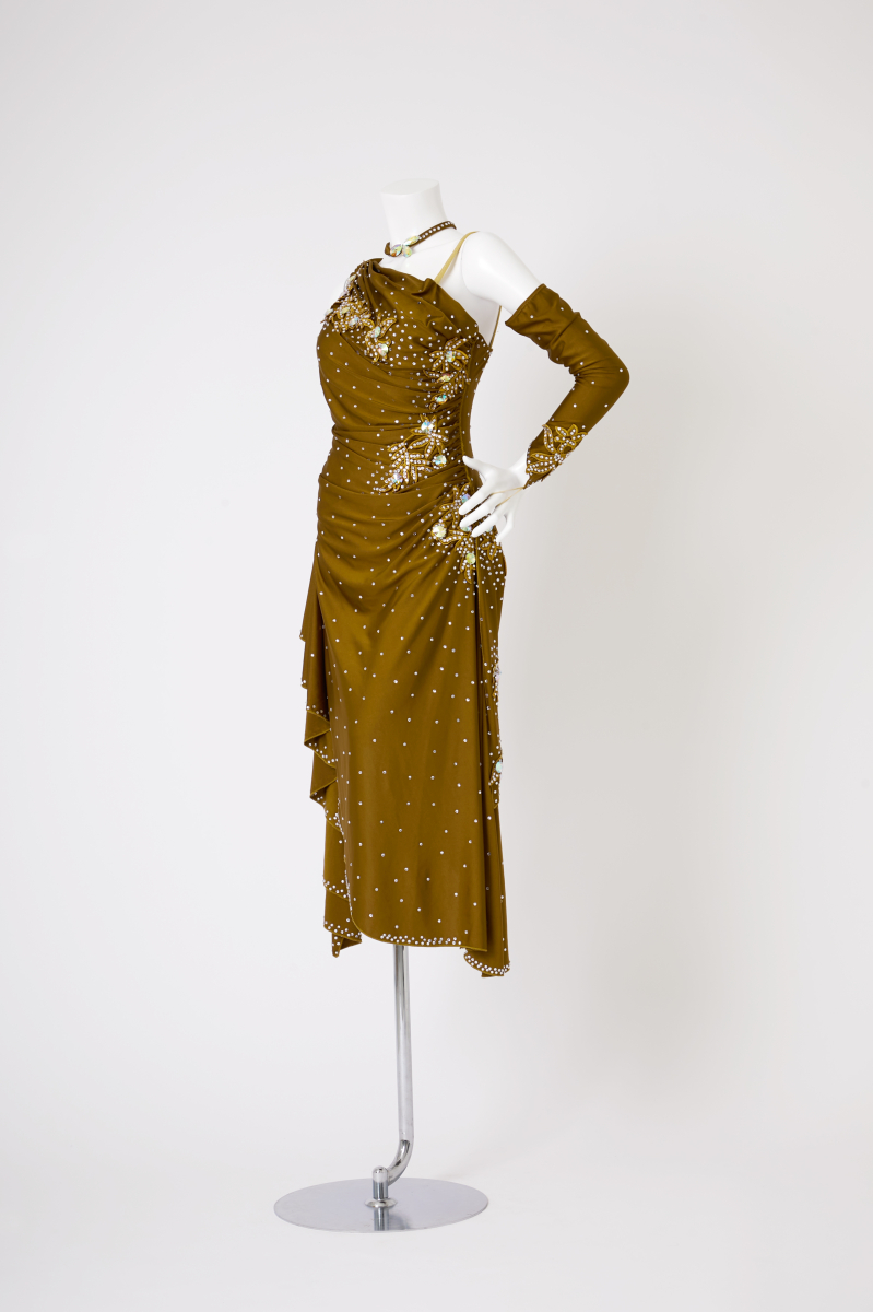このドレスは、深みのあるブラウンの生地に繊細な装飾が施された、非常に印象的な一着です。全体に散りばめられたラインストーンが光を受けて上品に輝きを放ちます。ボディーラインにフィットするドレープが施され、しなやかな女性らしさを引き立てるデザインです。右肩がカットアウトされたアシンメトリーなデザインは、モード感とセクシーさを兼ね備えており、視線を惹きつけます。さらに左肩から流れるような片袖と、腰元にかけて垂れるドレープが優雅な余韻を生み出しており、まるで舞うような柔らかさを演出します。ウエストからヒップラインにかけてラインストーンが散りばめられたモチーフが華やかさと気品を加えています。落ち着いた色味の中に、華やかなディティールと斬新なカッティングが見事に融合された、洗練された一着です。