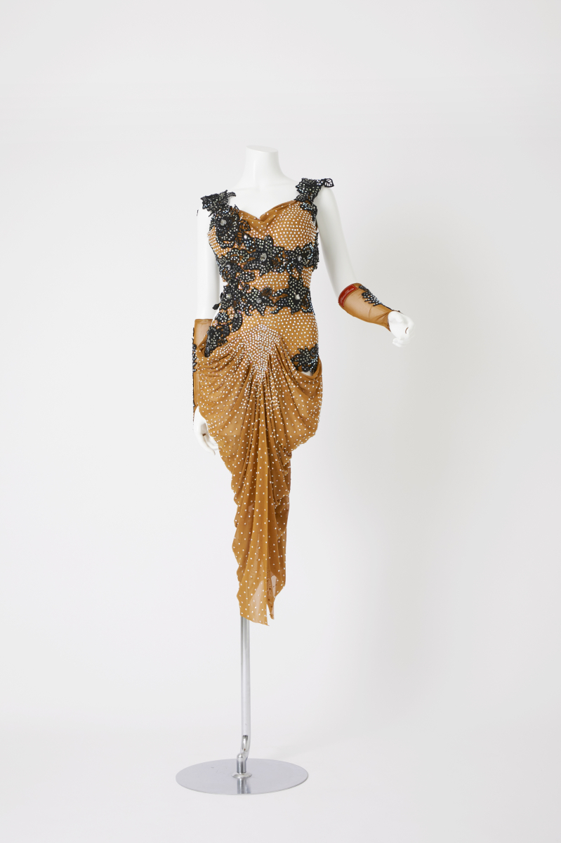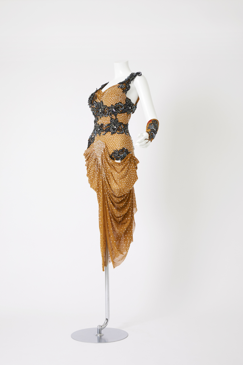 このドレスは、まさに「エレガント」と「妖艶」が見事に融合した、視線を集める特別な一着です。まず目を引くのは、濃いベージュカラー全体に散りばめられたオーロララインストーンが光を受けてキラキラと輝き、上品でゴージャスな印象を与えます。さらに、ラインストーンで散りばめられた立体的で繊細なブラックのモチーフが、ウエストから胸元、そして肩のラインににかけて大胆かつバランス良く配置されておりメリハリのある美しくシルエットを演出しています。この黒のコントラストが、全体の印象を引締め、よりドラマティックな雰囲気を醸し出しています。スカート部分のドレープの入れ方も絶妙で、動くたびに美しく揺れ、セクシーでエレガントな魅力を引き立てています。