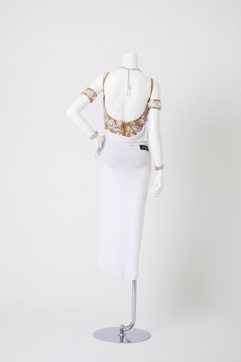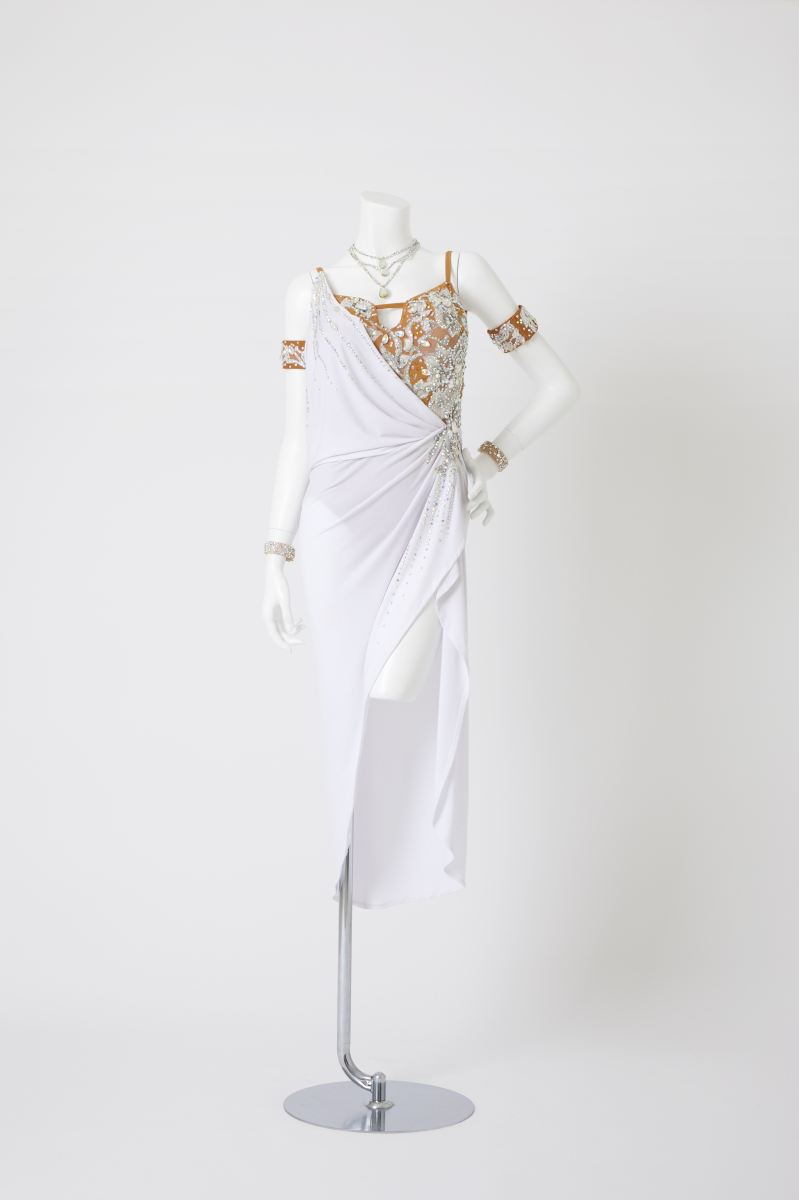 白の中に輝く繊細なストーン装飾がライトを受けるたびに上品な輝きを放ち、まるで女神のようなオーラを纏わせてくれる一着です。ボディーラインを美しく見せるドレープとスリットとのバランスが絶妙で、動きに合わせてしなやかに揺れ、美しいラインを生み出します。肩から流れるアシンメトリーなデザインが女性らしいラインを引き立て、気品のある存在感を演出します。フロアで大人の魅力を引き出したい方にピッタリの一着です。