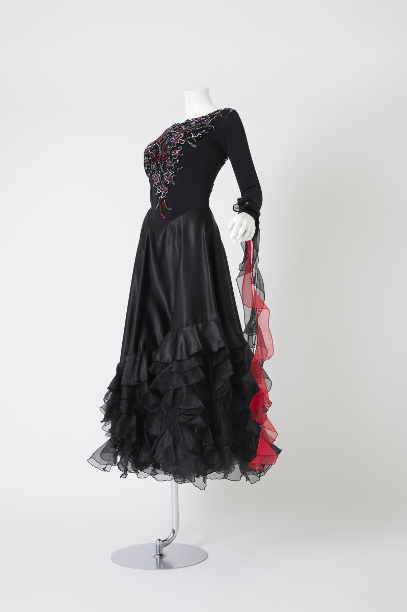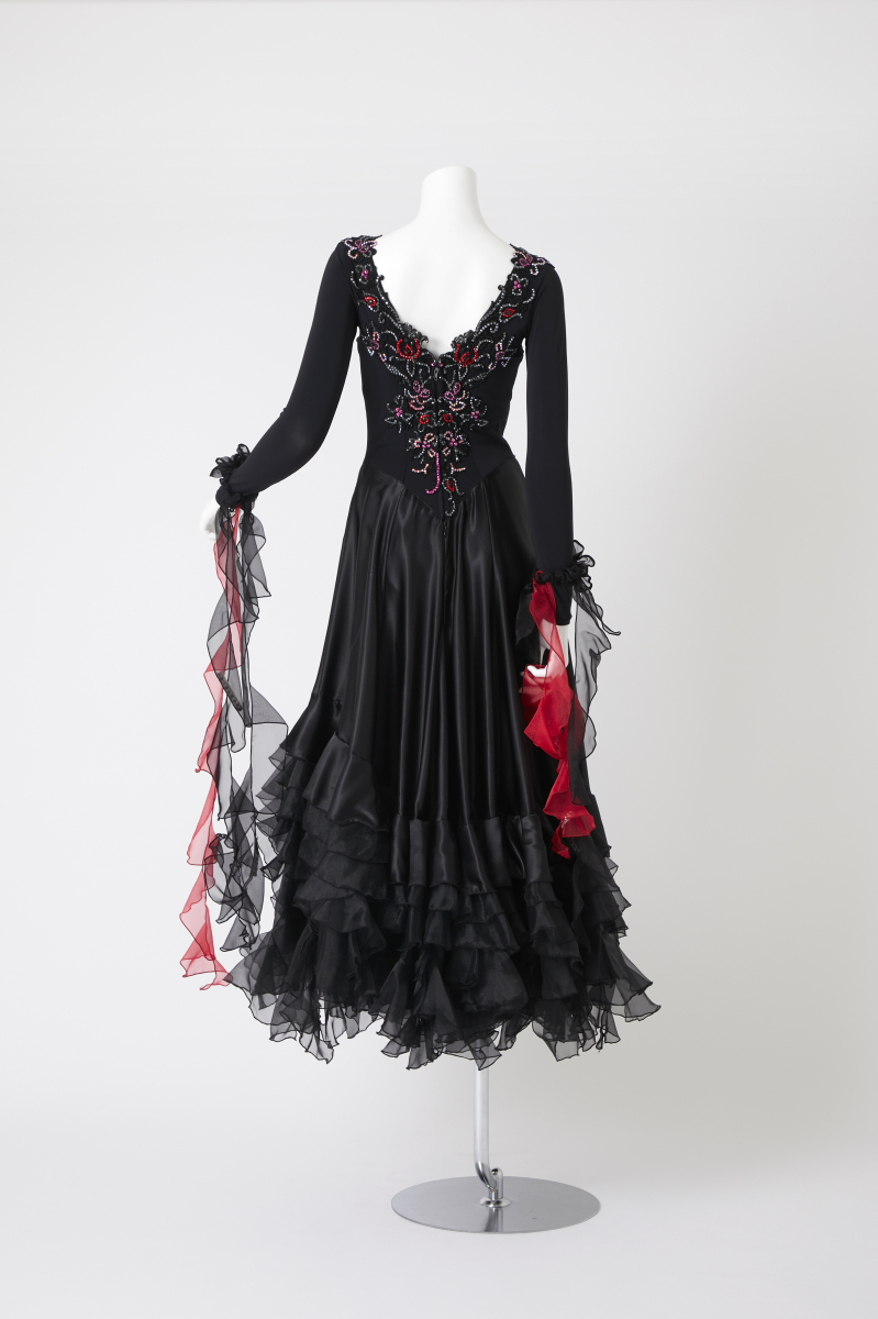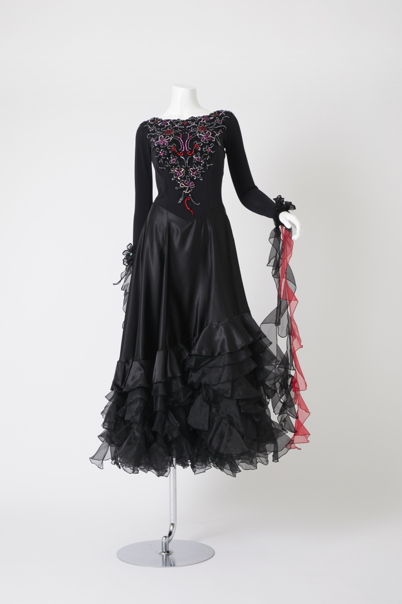 艶やかなブラックサテンに、赤とピンクのアクセントが妖艶に映えるエレガントなドレスです。上半身には繊細なモチーフにラインストーンが贅沢に施され、光を受けて華やかに輝きます。ボリュームのあるフリルスカートが軽やかに広がり、ダンスの動きをより美しく際立たせます。静かな情熱を秘めた大人の魅力を引き出してくれるデザインです。