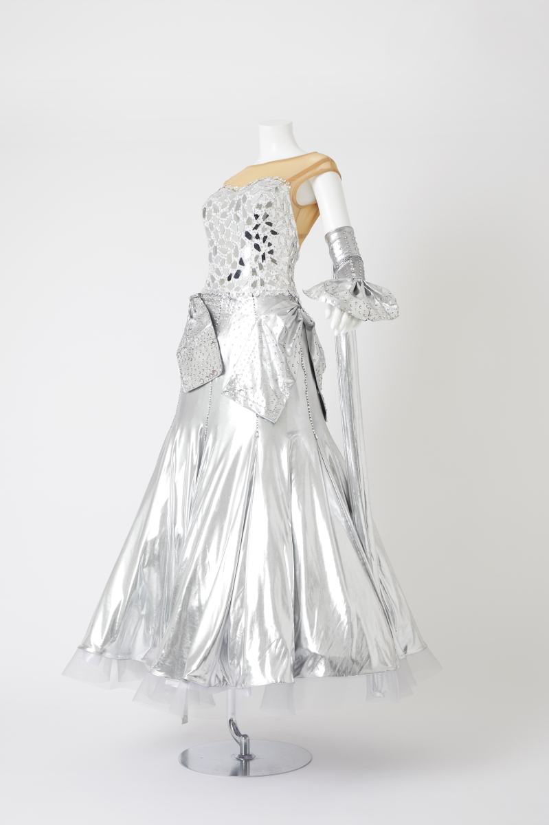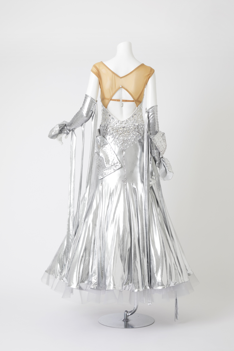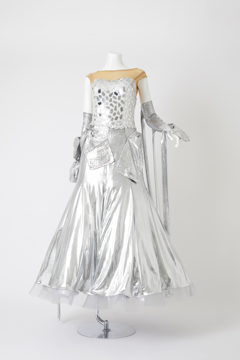 近未来的な美しさとクラシカルなシルエットが融合した、印象的なシルバードレスです。光沢感あふれる素材が動きの一瞬一瞬をドラマティックに照らし、胸元から腰元にかけてのミラー装飾がスタイリッシュな輝きを添えます。左右にあしらわれた立体的な大きなリボンは優雅さと華やかさをプラスし、全体のバランスを絶妙にまとめています。
