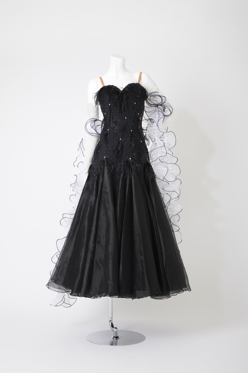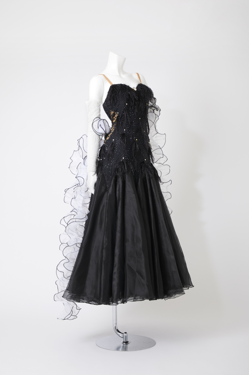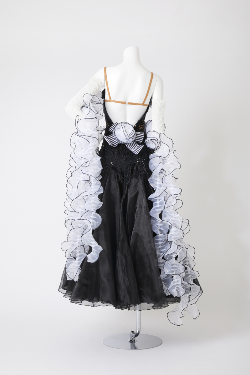深い黒が持つミステリアスな魅力と、繊細な装飾の輝きが融合した、非常に印象的なドレスです。深く豊かな黒のスカートは、フロアで踊るたびに美しいドレープと広がりを見せ、その軽やかな素材感がターンやスウィングの動きをドラマティックに演出します。特に注目すべきはボディー部分で、繊細なレースやラインストーン、そして羽根の装飾が贅沢に施されています。これらの立体的なディティールが、光を捕らえ、動くたびにキラキラと輝き、ダンサーの存在感を際立たせるでしょう。オフショルダーから続くシアーなドレスグローブやフリルフロートも、腕のラインを美しく見せ、ロマンティックな雰囲気を添えています。クラシックなエレガンスがありながらも、現代的な華やかさを持つ、優雅さと力強さを兼ね備えた、まさにダンスフロアの主役となる一着です。