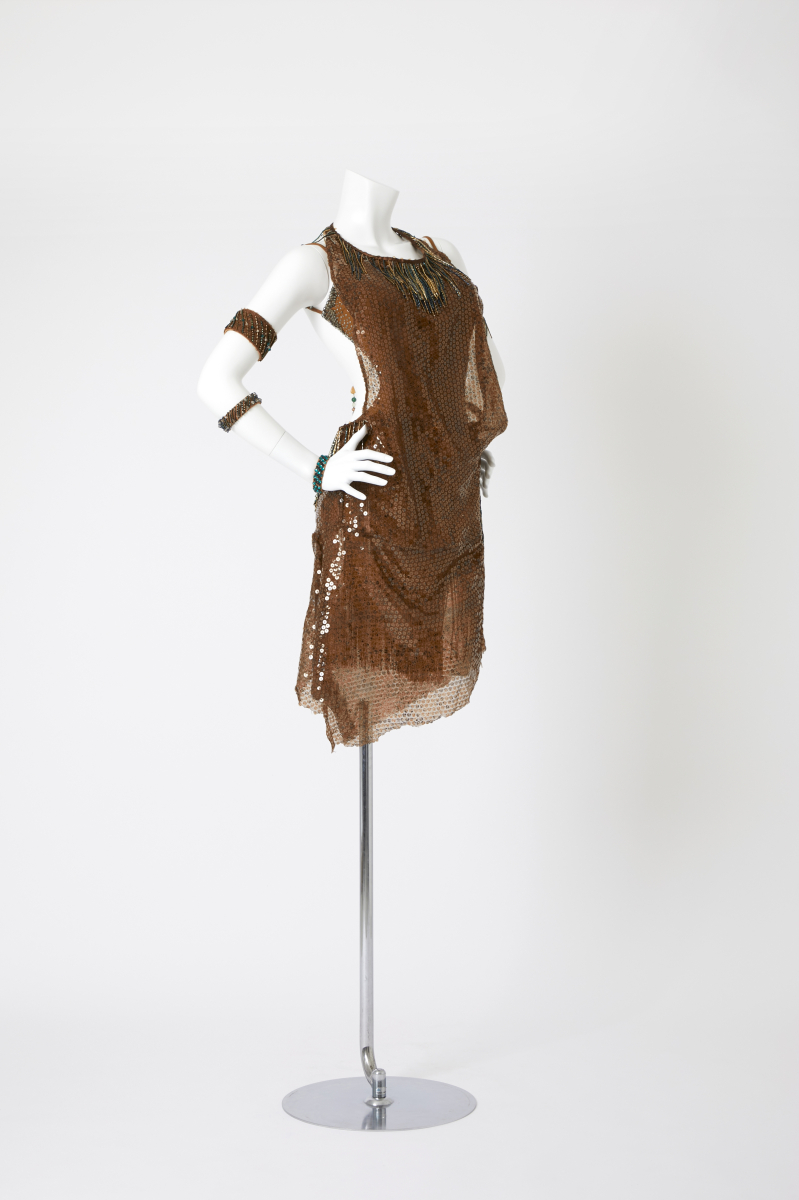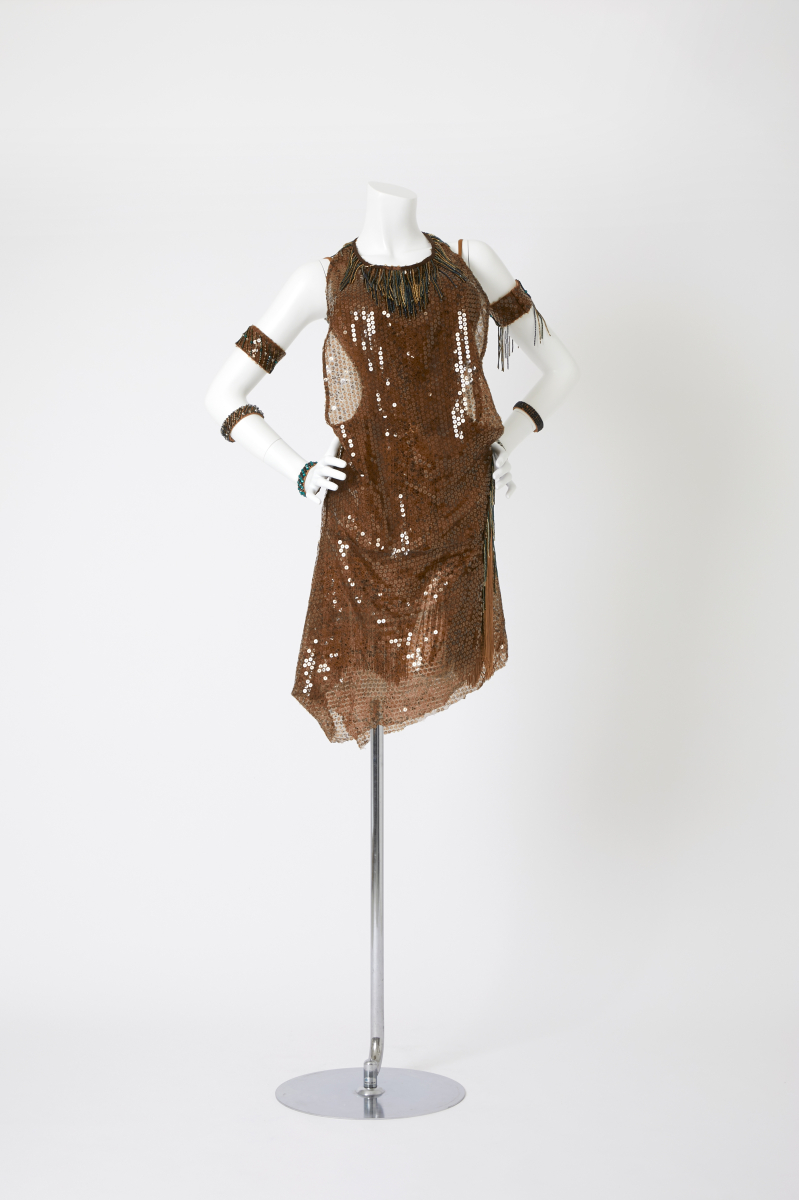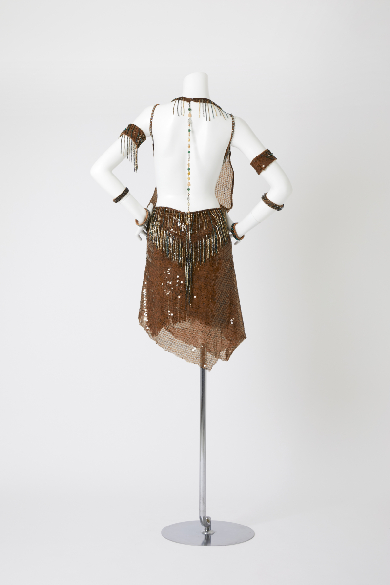 この肌なじみの良いブラウンの華麗なスパンコールドレスは、健康的な美しさを際立たせつつ、無数のスパンコールが放つ光沢で観客の視線を集めます。背中が大胆に開いたデザインは、女性らしさを強調し、力強い動きの中にも優雅さを漂わせます。ホルターネックから続く首元のビーズフリンジの装飾がエキゾチックな雰囲気を加え両腕のブレスレットが統一感のある豪華さを演出し腕の動きを大きく見せ、感情豊かな表現をサポートします。ウエストから流れるようなフリンジは、回転やステップの際に視覚的なアクセントとなり、情熱的なダンスフロアでの存在感を際立たせるでしょう。、